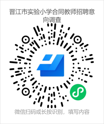 扫描二维码填写招聘意向调查表,同时下载《晋江市实验小学合同教师应聘报名表》,填写完整后发送至邮箱382870557@qq.com。